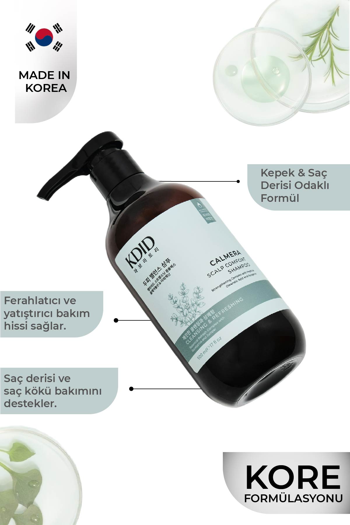 KDID Calmera Scalp Comfort Shampoo, saç derisinin doğal dengesinin korunmasına yardımcı olmak üzere geliştirilmiş, arındırıcı ve ferahlatıcı bir şampuandır. Salisilik Asit içeren formülü, saç derisindeki fazla sebumu ve birikimleri temizlemeye yardımcı olurken; peptitler, oleanolik asit ve apigenin içeren güçlendirici kompleks, saç derisi ve saç kökü bakımını destekler.