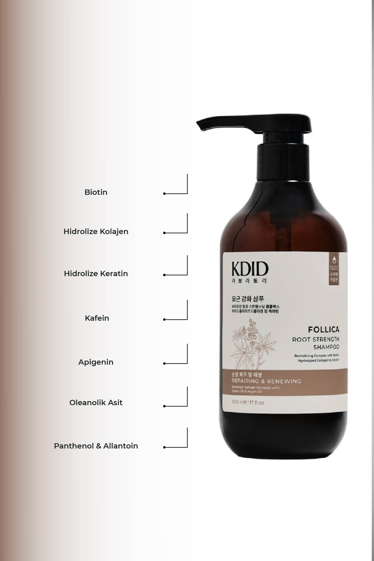 FOLLICA Root Strength Shampoo, saç derisi ve saç köklerinin bakımını desteklemek, saçın daha sağlıklı ve daha dayanıklı görünmesine yardımcı olmak üzere geliştirilmiş güçlendirici bir şampuandır. Nazik ancak etkili temizleme formülü, saçı ağırlaştırmadan kir ve kalıntıların arındırılmasına yardımcı olur.